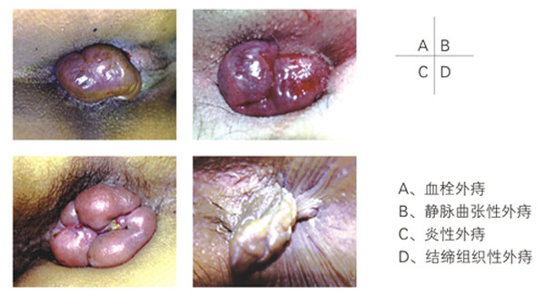 2、外痔: 以疼痛、肿块为主要症状,肛门周围长有大小不等、形状不一的皮赘。